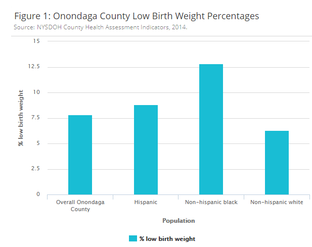 Figure 1: Despite Onondaga County having low birth weight rates that are comparable to New York State (7.6%), there are substantial disparities in these birth outcomes by race and ethnicity in Onondaga County. The rate among non- hispanic blacks (12.8%) is more than double the rate among non-hispanic whites (6.3%).
