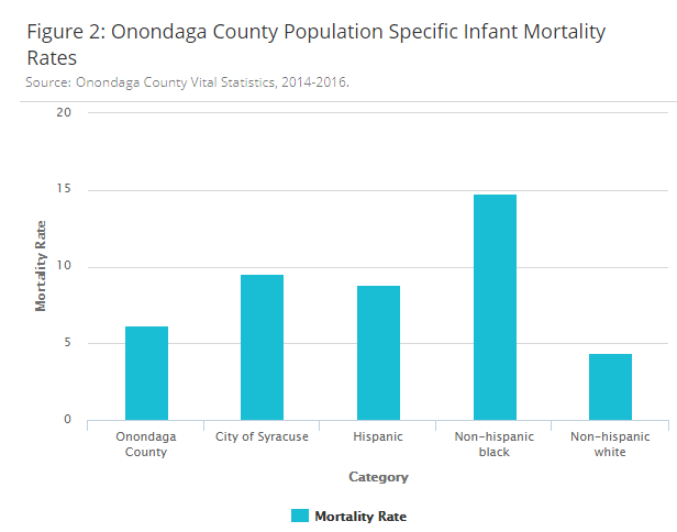 Figure 2: The infant mortality rate among the black population in Onondaga County (14.8 infant deaths per 1,000 live births) is substantially higher than among the white population in Onondaga County: 4.4 infant deaths per 1,000 live births).