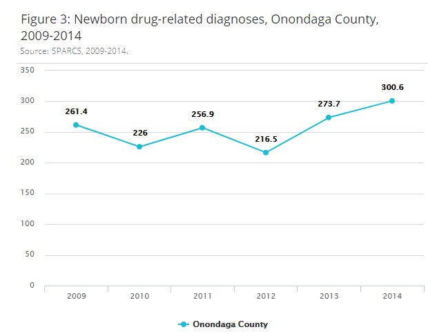 Notes: Figure 3: The Onondaga County newborn drug-related diagnosis rate has increased over the last three years. Onondaga County has the third highest rate in New York State as of 2014. The rate is 300.6 births per 10,000 discharges.