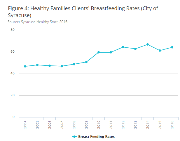 Notes: Figure 4: This is the rate of Healthy Families clients in the City of Syracuse who breastfed per year. Since 2004, rates have increased 17.5%, from 46.6% to 64.1%.